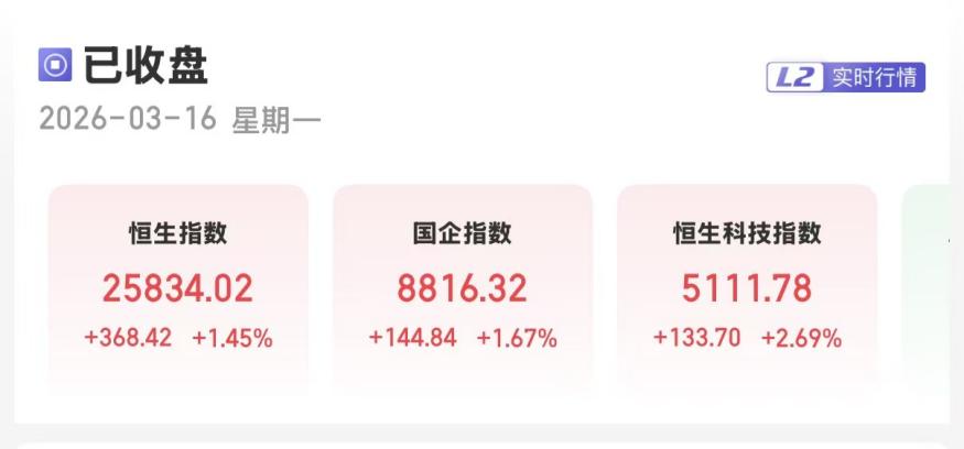 元股证券:ygzq.hk配资炒股上证报中国证券网讯(卢伊 记者 严晓菲)3月16日,港股三大指数收涨。截至收盘,恒生指数涨1.45%,报25834.02点;恒生国企指数涨1.67%,报8816.32点;恒生科技指数涨2.69%,报5111.78点。