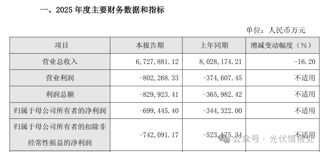 报告期内,光伏行业仍面临阶段性供需失衡,产业链各环节开工率处于低位,市场竞争进一步加剧,叠加国际贸易保护政策持续影响,上半年光伏产品价格较去年同期普遍承压;尽管下半年光伏产品价格在行业反内卷工作推进下逐步提升,然而受硅料、银浆等关键原材料成本快速上涨的影响,公司组件业务全年盈利能力较上年同期有所下滑,2025 年度公司经营业绩仍然亏损。同时基于谨慎性原则,公司对出现减值迹象的长期资产进行减值测试,经过审慎评估将按照业会计准则计提资产减值准备,对业绩有一定影响。 报告期内,公司积极把握储能行业发展机遇,公司加速推动储能业务和系统解决方案业务转型发展,持续加大研发创新投入,加速拓展全球营销网络布局。依托成熟的全球化系统解决方案能力和高效交付服务体系,公司储能业务海外市场出货量实现快速增长,市场份额显著提升。